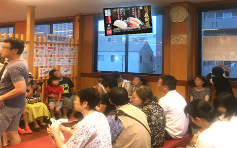 たとえばスシローは幅広い年代に利用されており、特にファミリー層の利用が多い点が特徴です。家族でお寿司を楽しみに来ている人が多い環境のため、食事中や待ち時間の合間にサイネージが自然と視界に入り、繰り返しの接触による認知形成が期待できます。